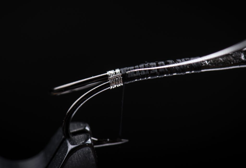 Step 5: Attach a piece of black floss and wind the thread to just behind the hook eye. Wrap the floss forward to create a smooth, even body for the front half. Secure and trim.