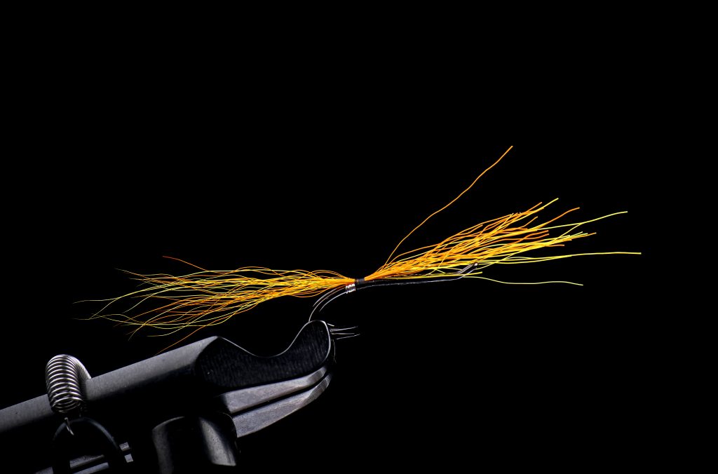Step 2: Trim a few strands of orange and yellow bucktail and tie them in as the tail, 1-1.5 times the hook shank length. Secure the hair along the shank up to the hook eye.