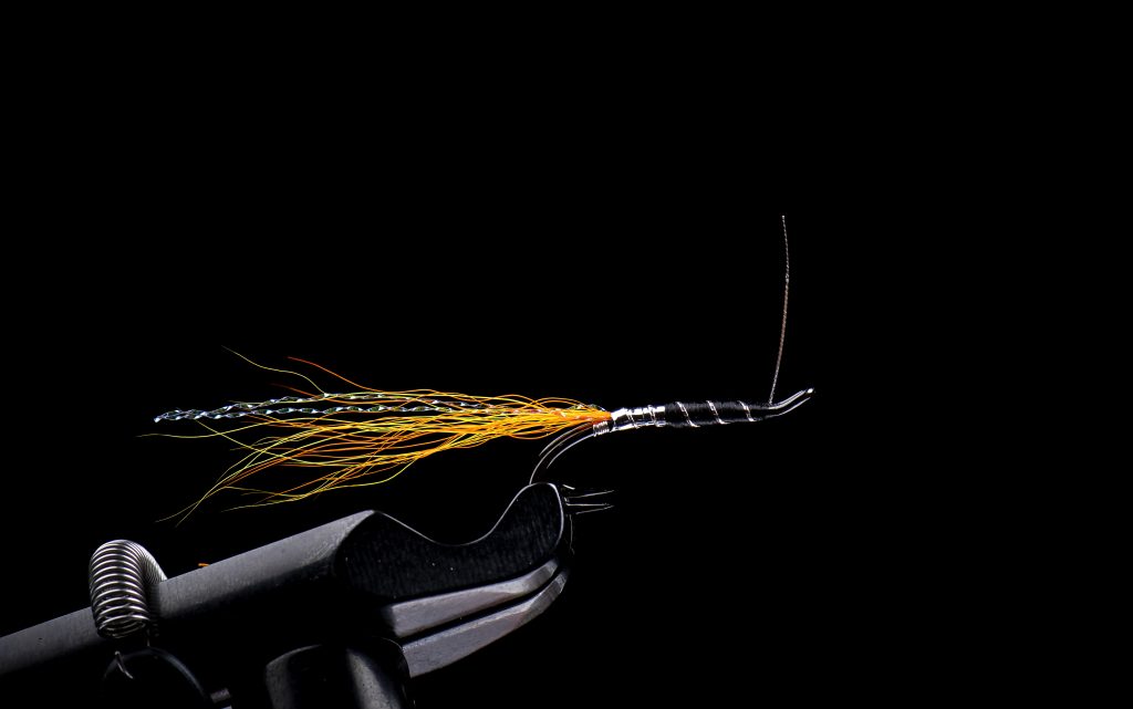 Step 1: Secure the thread to the hook and tie in a piece of fine oval silver tinsel at the barb. Wind the tinsel down into the hook bend for 5-6 turns. Bring the tinsel back between the hook points and over the wound section, securing it firmly.