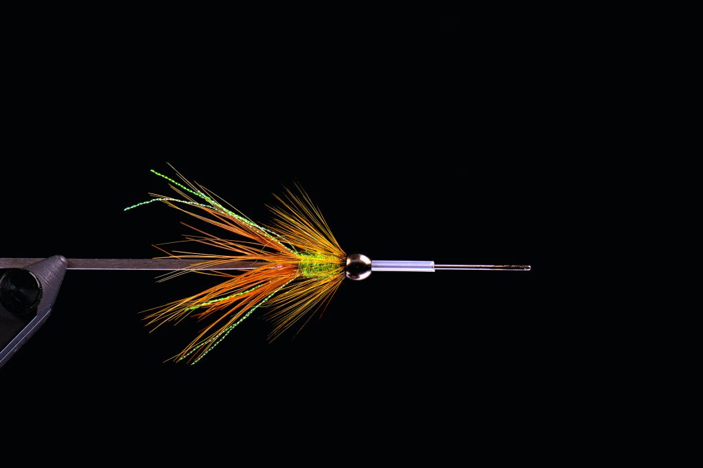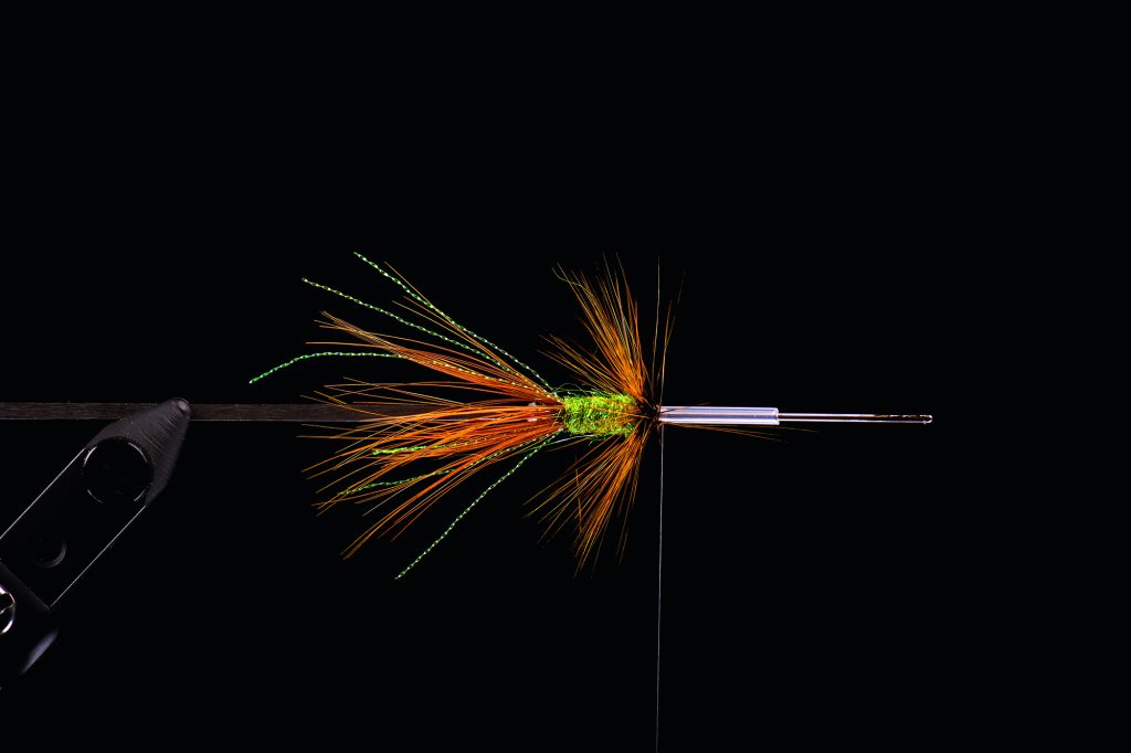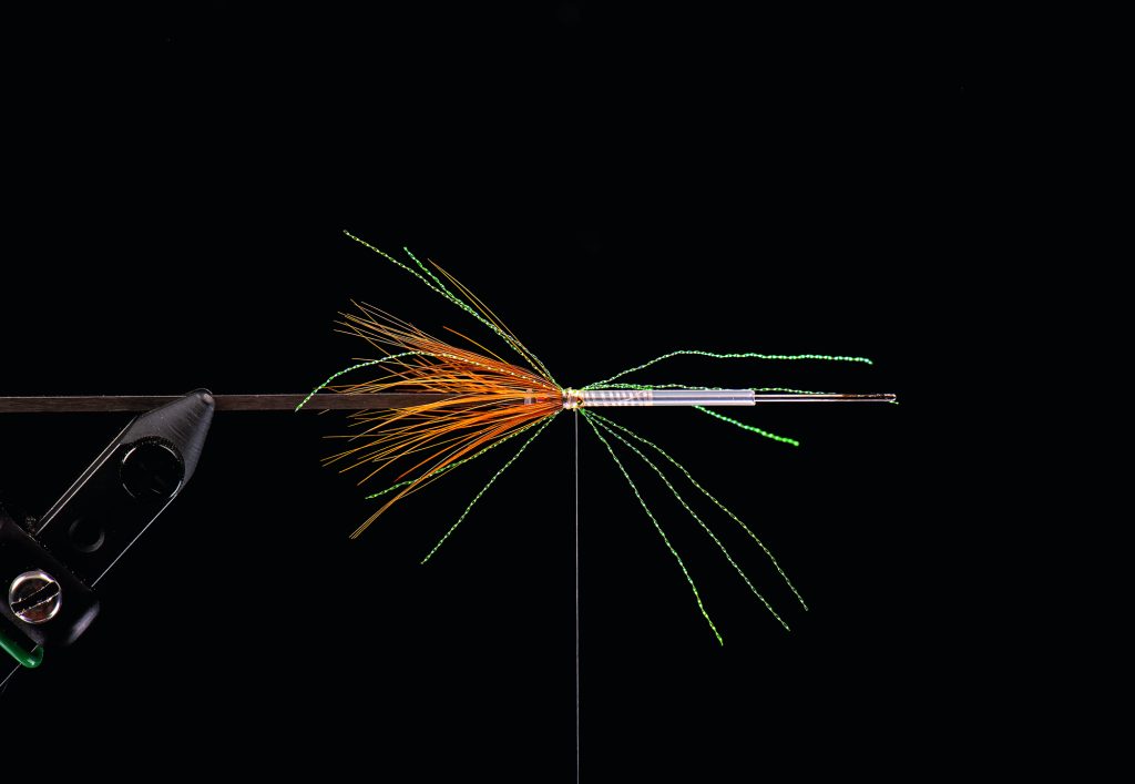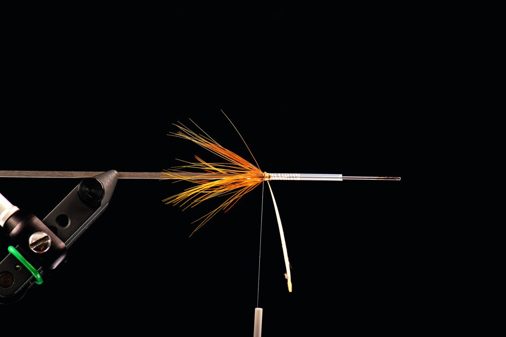 Attach the golden pheasant hackle and wrap it a few times in front of the butt.